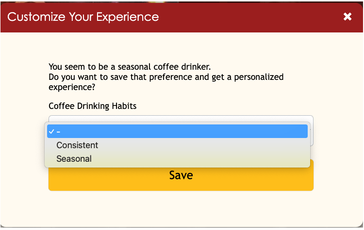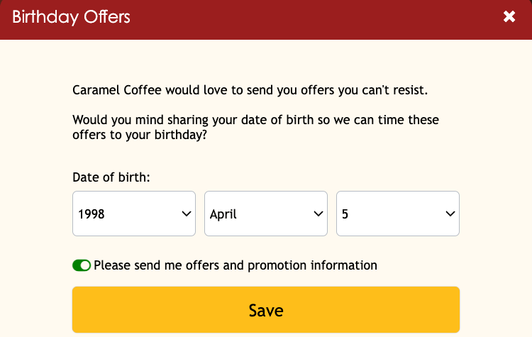 In this web engagement example, a coffee brand requests a customer’s date of birth in exchange for an exclusive offer.