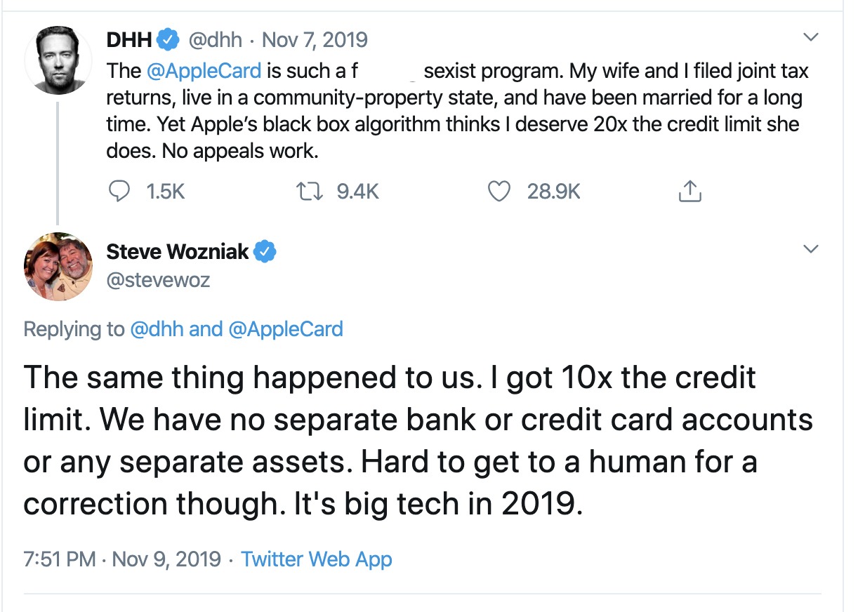 When the Apple credit card came out, there was a nearly immediate backlash due to their blatantly sexist policy with regard to how credit limits were established. None other than Steve Wozniak, co-founder of Apple pointed it out.